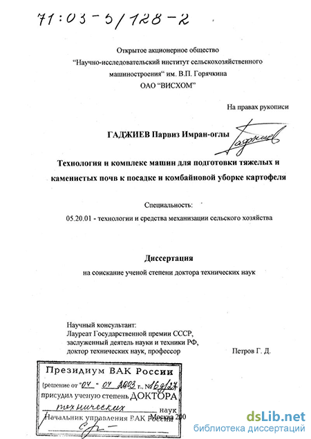 Гаджиев Парвиз Имран оглы. Технология и комплекс машин для подготовки тяжелых и каменистых почв к посадке и комбайновой уборке картофеля : диссертация ... доктора технических наук : 05.20.01.- Москва, 2002.- 232 с.: ил. РГБ ОД, 71 03-5/128-2