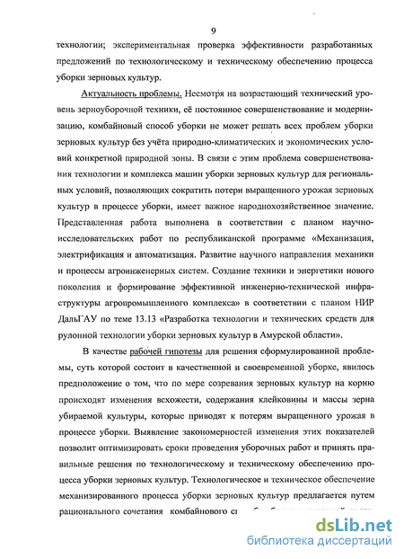 Цель работы. Теоретическое и экспериментальное обоснование технологии и необходимого перечня технических средств уборки зерновых культур в условиях Амурской области, обеспечивающих качественную и своевременную уборку с минимальными потерями.
