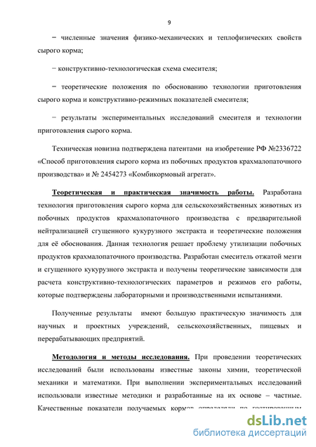 Методология и методы исследования. При проведении теоретических исследований были использованы известные законы химии, теоретической механики и математики. При выполнении экспериментальных исследований использовали известные методики и разработанные на их основе - частные. Качественные показатели получаемых кормов определяли по тестированным методикам. Для осуществления лабораторных и производственных испытаний использовались современные приборы и установки. Обработку данных в экспериментальных исследований осуществляли методом математической статистики с использованием ПЭВМ и современных компьютерных программ.