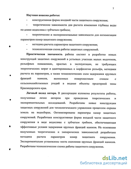 Практическая значимость работы состоит в разработке новых конструкций защитных сооружений в устьевых участках малых водотоков, рельефных понижениях, простых в эксплуатации, не требующих энергетических затрат и адаптированных к морфологии рельефа, методики расчета их параметров, а также технологических схем задержания крупных фракций наносов, выносимых поверхностным стоком с сельскохозяйственных угодий в водные объекты предгорной зоны Краснодарского края.