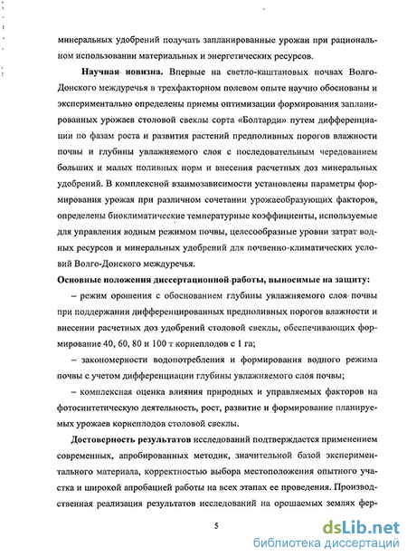 Научная новизна. Научно обоснованы и экспериментально определены приемы оптимизации формирования запланированных урожаев столовой свеклы сорта «Болтарди» на светло-каштановых почвах Волго-Донского междуречья в трехфакторном полевом опыте путем дифференциации по фазам роста и развития растений предполивных порогов влажности почвы и глубины увлажняемого слоя с последовательным чередованием больших и малых поливных норм и внесения расчетных доз минеральных удобрений. В комплексной взаимозависимости установлены параметры формирования урожая при различном сочетании урожаеобра-зующих факторов, определены биоклиматические температурные коэффициенты, используемые для управления водным режимом почвы, целесообразные уровни затрат водных ресурсов и минеральных удобрений для поч-венно-климатических условий Волго-Донского междуречья. Основные положения, выносимые на защиту: