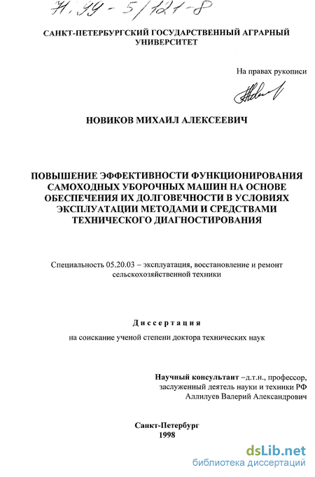 При решении данной проблемы получено 5 авторских свидетельств, 1 патент и одно положительное решение на изобретение; опубликовано 42 научные работы, в т.ч. совместно с ГОСНИТИ «Руководство по диагностированию самоходных комбайнов с помощью автоматизированного машинотестера КИ-13950-ГОСНИТИ», «Рекомендации по диагностированию самоходных уборочных машин виброакустическим методом с помощью электронного прибора КИ-28062 ГОСНИТИ-СПГАУ и комплекта механических устройств КИ-11382 ГОСНИТИ» общим объемом 7 п.л.. Результаты исследований использованы при создании серийно выпускаемой диагностической установки КИ-13950-ГОСНИТИ, малогабаритного электронного прибора КИ-28062ГОСНИТИ-СПГАУ, в учебном процессе ряда вузов в лекциях, лабораторно-практических занятиях, научно-исследовательской работе студентов и аспирантов. В совместном руководстве с профессором Аллиуевым В.А. автором работы подготовлено четыре кандидата технических наук.