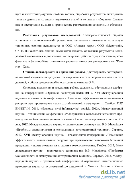 Практическая значимость выполненных исследований подтверждена использованием технологического процесса повышения эксплуатационных свойств дизельных топлив в ООО «Акцент Агро», ООО «Меркурий», СХПК ПЗ колхоз им. Ленина Тамбовской области.