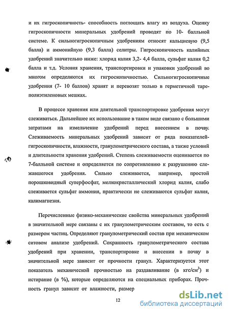 Существенное значение для эффективного использования удобрений имеет правильная организация их транспортировки, хранения, подготовки для внесения в почву. Такая организация невозможна без знания основных физико-механических и химических свойств удобрений, таких, как растворимость в воде, гигроскопичность, слеживаемость, влагоемкость, рассеиваемость, гранулометрический состав и прочность гранул и других.