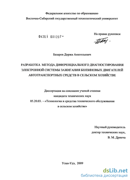 Базаров, Доржи Анатольевич. Разработка метода диференциального диагностирования электронной системы зажигания бензиновых двигателей автотранспортных средств в сельском хозяйстве : диссертация ... кандидата технических наук : 05.20.03 / Базаров Доржи Анатольевич; [Место защиты: Вост.-Сиб. гос. технол. ун-т].- Улан-Удэ, 2009.- 200 с.: ил. РГБ ОД, 61 10-5/838