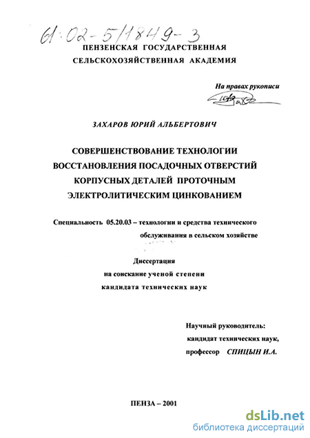 Захаров Юрий Альбертович. Совершенствование технологии восстановления посадочных отверстий корпусных деталей проточным электролитическим цинкованием : диссертация ... кандидата технических наук : 05.20.03.- Пенза, 2001.- 170 с.: ил. РГБ ОД, 61 02-5/1849-3