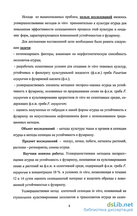 Объект исследований - методы культуры ткани и органов в селекции огурца и методы селекции на устойчивость к фузариозу.
