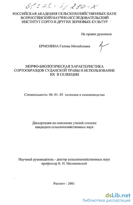 Ермолина Галина Михайловна. Морфо-биологическая характеристика сортообразцов суданской травы и использование их в селекции : диссертация ... кандидата сельскохозяйственных наук : 06.01.05.- п. Рассвет, 2001.- 130 с.: ил. РГБ ОД, 61 02-6/280-X