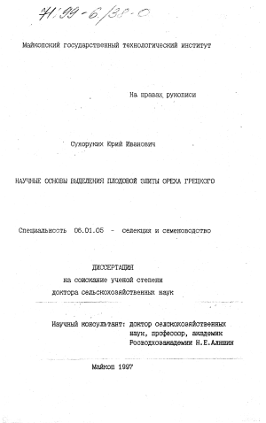 АПРОБАЦИЯ РАБОТЫ. Основные выводы и предложения диссертации докладывались на заседаниях ученого совета Белореченской лаборатории селекции орехоплодных пород Центрального НИИ лесной генетики и селекции (1982 - 1987 гг.). Всесоюзного НИИ лесоводства и механизации лесного хозяйства (1989 - 1991 г.). Воронежской лесотехнической академии (1992), НИИ горного лесоводства и экологии леса (1992), республиканской конференции по охране природы (1995), Международной научно-практической конференции по генетике и селекции (1996), Всероссийском заседании общества охраны природы (1996), заседании южного отделения Российской экологической академии (1996), конференциях Майкопского государственно технологического института (1996,1997), ученых советах Майкопской опытной станции ВИР им.Н.И.Вавилова (1997), Майкопского государственного технологического института (1997).