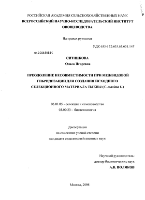 5. Ситникова (Федоришина), О.И. Получение межвидовых гибридов тыквы при использовании эмбриокультуры / А.В. Поляков, О.И. Ситникова, О.Ф. Чикризова // Методические рекомендации. - М.: ГНУ ВНИИО, 2006. -24 с.