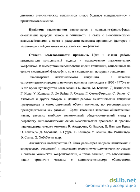 Степень исследованности проблемы. Цель и задачи работы предполагали комплексный подход к исследованию межэтнических конфликтов. В диссертации использованы идеи и концепции, относящиеся не только к социальной философии, но и к социологии, истории и этнологии.