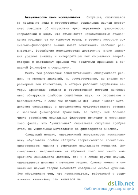 Актуальность темы исследования. Ситуация, сложившаяся за последние годы в отечественных социальных науках позволяет говорить об отсутствии ярко выраженных приоритетов, направлений и школ. Это объясняется невозможностью становления традиции за то короткое время, в течение которого социально-философское знание имеет возможность свободно развиваться. Российские исследователи достаточно много внимания уделяют анализу и интерпретации тех социальных теорий, которые к настоящему времени уже заслужили признание в западной философии и социологии.
