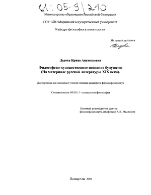 Цель диссертации - методологическое обоснование философско-художественного познания будущего на материале русской классической литературы и публицистики. Эта цель предполагает решение основных исследовательских задач: