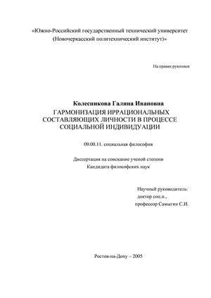 Предмет исследования: иррациональные составляющие личности в процессе их социальной гармонизации.