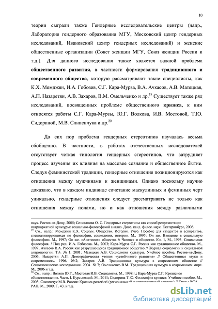 Стебуновой. Тендерные проблемы в области политики и экономики освещают исследования С.Г. Айвазовой, А.А. Гендаш, Н.М. Римашевской, Е.Б. Мезенцевой. Тендерные стереотипы в средствах массовой информации и коммуникации рассматриваются А.В. Кирилиной, И.В. Трошевым, С.С. Скорняковой, И.В. Саморуковой. Весомый вклад в развитие тендерного образования внесли такие специалисты, как И.В. Костикова, Л.В. Штылева, О.В. Шнырова, Л.П. Шустова, А.В. Митрофанова и др. Большую роль в развитии гендерологии сыграли также Тендерные исследовательские центры (напр., Лаборатория тендерного образования МГУ, Московский центр тендерных исследований, Ивановский центр тендерных исследований) и женские общественные организации (Совет женщин МГУ, Союз женщин России и т.д.). Для данного исследования также является важной проблема общественного развития, которую рассматривают такие специалисты, как К.Х. Момджян, И.А. Гобозов, С.Г. Кара-Мурза, В.А. Ачкасов и др.8 Существует также ряд исследований, посвященных проблеме общественного кризиса, к ним относятся работы С.Г. Кара-Мурзы, Ю.Г. Волкова, Т.Ю. Сидориной, М.В. Слипенчука и др.9