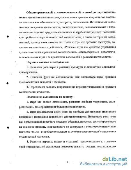 Общетеоретической и методологической основой диссертационного исследования является совокупность таких приемов и принципов научного познания как объективность, историзм, системность. Источниками исследования послужили философские, социологические, психологические и педагогические научные труды отечественных и зарубежных ученых, посвященные проблемам игры и личностной социализации, а также материалы исследований, проведенных автором по темам «Игра как прототип культуры, социального поведения и действия», «Ролевые игры как средство управления процессами целенаправленной социализации», «Философские и педагогические основания игры и ее проявления в языковой и речевой деятельности».