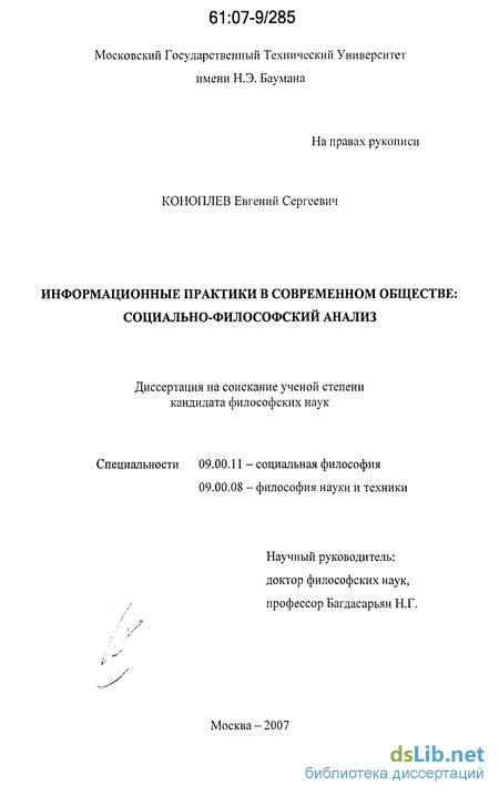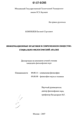 Основные идеи диссертационного исследования прошли апробацию на ряде научно-практических конференций, на VI и VII Энгельмейеровских чтениях (Москва-Дубна, март 2002 г. и март 2003 г.), на конференции «Интеллектуальная собственность в гуманитарном измерении» (Москва, РГГУ, 2005), на IV Российском Философском Конгрессе «Философия и будущее цивилизации» (Москва, философский факультет МГУ, май 2005 г.), а также на аспирантских семинарах Факультета социальных и гуманитарных наук МГТУ им. Н.Э.Баумана. По результатам исследования опубликовано 7 работ общим объемом 2 п.л.