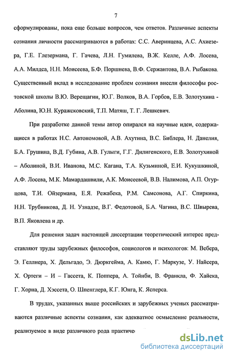 сознания личности рассматриваются в работах: С.С. Аверинцева, А.С. Ахиезе-ра, Г.Е. Глезермана, Г. Гачева, Л.Н. Гумилева, В.Ж. Келле, А.Ф. Лосева, А.А. Милдса, Н.Н. Моисеева, Б.Ф. Поршнева, В.Ф. Сержантова, В.А. Рыбакова. Существенный вклад в исследование проблем сознания внесли философы ростовской школы В.Ю. Верещагин, Ю.Г. Волков, В.А. Горбов, Е.В. Золотухина -Аболина, Ю.Н. Куражсковский, Т.П. Матяш, Т. Г. Лешкевич.