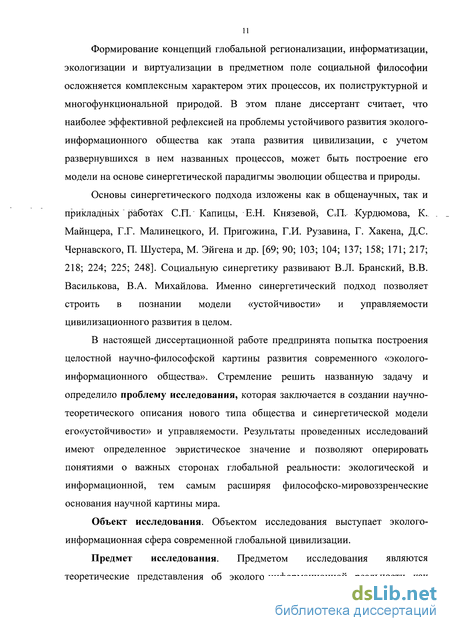 Теоретико-методологические основания исследования. Теоретическая основа диссертационного исследования представлена целым спектром философско-теоретических представлений о взаимодействии общества и природы. Это, прежде всего, концепция диалектики природы и цивилизационного развития Ф. Энгельса, теории цивилизационного развития (К. Маркс, Г. Морган, П. Сорокин, А.Дж. Тойнби, О. Шпенглер, Ф. Энгельс,), концепции системной научно-философской картины мира (Э.В. Гирусов, Н.Н. Моисеев, А.И. Субетто, А.Д. Урсул), единства социального и природного в общественном развитии (В.И. Вернадский), динамического и экологического равновесия (В.И. Данилов-Данильянц, К.С. Лосев, Ю. Одум, Н.Ф. Реймерс), концепции целостного мировоззрения(В.А. Балханов, С.Ю. Колчигин), концепции устойчивого развития(В.В. Мантатов, Л. Милбрайт, Р. Норгарт, Д. Нортон и др.), философии информационной цивилизации(Р.Ф. Абдеев, А.И. Ракитов), теории информационного общества (Д. Белл, В.Л. Иноземцев, Ё. Масуда, М. Кастельс, Т. Стоуньер, Э. Тофллер, А.Д. Урсул, Ф. Уэбстер), концепция ноосферного пути развития цивилизации (В.И.Вернадский, Э.В. Гирусов ,Э. Леруа, А.П. Назаретян, А.И. Субетто, П.Теяр де Шарден, А.Д. Урсул,), теории социальной синергетики(В.В. Василькова, Е.Н. Князева, С.П. Курдюмов, и др), идеи глобалистики и виртуалистики. Все приведенные теоретические основания являются базисом исследования возможных путей развития эколого-информационного общества.