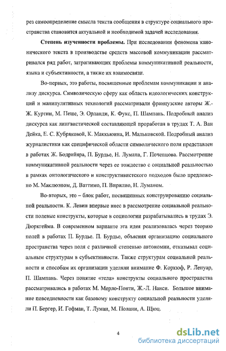 Степень изученности проблемы. При исследовании феномена канонического текста в производстве средств массовой коммуникации рассматривался ряд работ, затрагивающих проблемы коммуникативной реальности, языка и субъективности, а также их взаимосвязи.