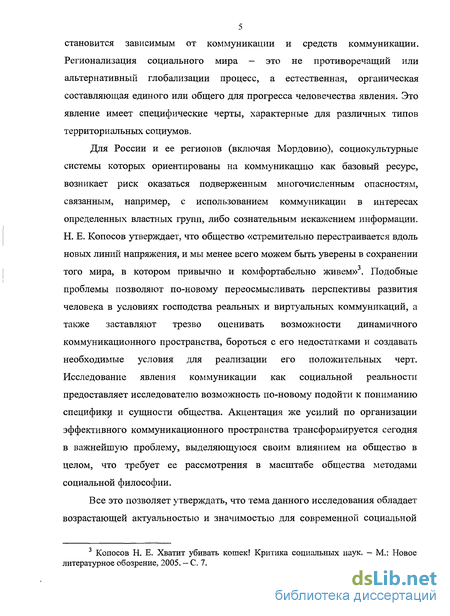 Для России и ее регионов (включая Мордовию), социокультурные системы которых ориентированы на коммуникацию как базовый ресурс, возникает риск оказаться подверженным многочисленным опасностям, связанным, например, с использованием коммуникации в интересах определенных властных групп, либо сознательным искажением информации. Н. Е. Копосов утверждает, что общество «стремительно перестраивается вдоль новых линий напряжения, и мы менее всего можем быть уверены в сохранении того мира, в котором привычно и комфортабельно живем» . Подобные проблемы позволяют по-новому переосмысливать перспективы развития человека в условиях господства реальных и виртуальных коммуникаций, а также заставляют трезво оценивать возможности динамичного коммуникационного пространства, бороться с его недостатками и создавать необходимые условия для реализации его положительных черт. Исследование явления коммуникации как социальной реальности предоставляет исследователю возможность по-новому подойти к пониманию специфики и сущности общества. Акцентация же усилий по организации эффективного коммуникационного пространства трансформируется сегодня в важнейшую проблему, выделяющуюся своим влиянием на общество в целом, что требует ее рассмотрения в масштабе общества методами социальной философии.