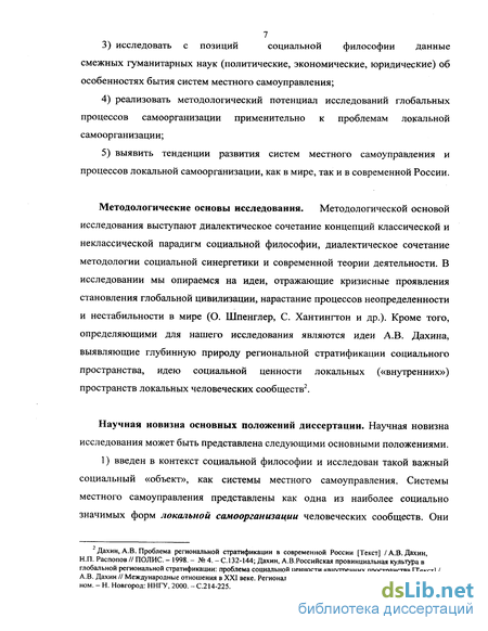 Научная новизна основных положений диссертации. Научная новизна исследования может быть представлена следующими основными положениями. 1) введен в контекст социальной философии и исследован такой важный социальный «объект», как системы местного самоуправления. Системы местного самоуправления представлены как одна из наиболее социально значимых форм локальной самоорганизации человеческих сообществ. Они