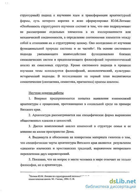 структурный) подход к изучению идеи и трансформации архитектурной формы, суть которого коротко и ясно сформулировал Ю.М.Лотман: «Особенность структурного изучения состоит в том, что оно подразумевает не рассмотрение отдельных элементов в их изолированности или механической соединенности, а определение соотношения элементов между собой и отношения их к структурному целому. Оно неотделимо от изучения функциональной природы системы и ее частей»1. На основе системного подхода увязывающего взаимодействие функционально близких символических систем и предполагающего философский герменевтический анализ их смысловых структур. Кроме системного подхода в процессе изучения темы используется философский, аксиологический, культурно-исторический подходы. В исследовании на первый план выдвигаются семиотические (синтактика, семантика, прагматика) приемы анализы.