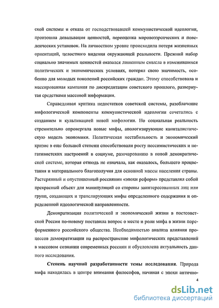 Демократизация политической и экономической жизни в постсоветской России по-новому поставила вопрос о месте и роли мифа в жизни пореформенного российского общества. Необходимостью анализа влияния процессов демократизации на распространение мифологических представлений в массовом сознании современных россиян и обусловлена актуальность данного исследования.