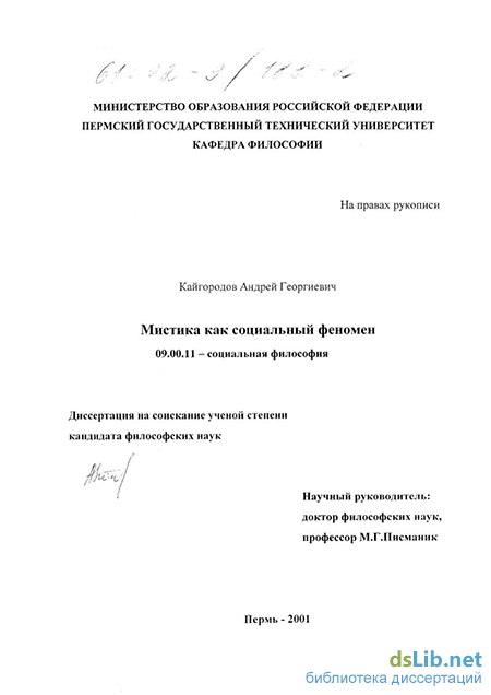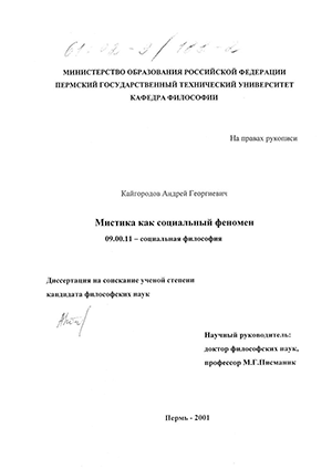 Кайгородов Андрей Георгиевич. Мистика как социальный феномен : диссертация ... кандидата философских наук : 09.00.11.- Пермь, 2001.- 174 с.: ил. РГБ ОД, 61 02-9/188-2