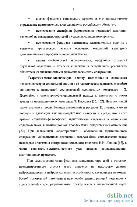 Теоретико-методологическую основу исследования составляют положения теории социальной аномии в её классическом варианте, с особым вниманием к ценностной составляющей «социальных контрактов - Э. Дюркгейм, и структурно-функциональный подход к ценностям с точки зрения их мотивационного потенциала Т. Парсонса [36; 152]. Перспективной также оказалась теория баланса требований и ресурсов К. Левина, в части подхода к адаптации как взаимодействию личности и среды, что имеет прямые социально-философские эвристические следствия в отношении содержательной и мотивационной проблематики общественных отношений [72]. При дальнейшей характеристике и обосновании адаптационного содержания общественных отношений автором были использованы также некоторые положения «антропосоциетального подхода» Н.И. Лапина [67], в части социетально-деятельностного угла анализа социализационно-адаптационных процессов.