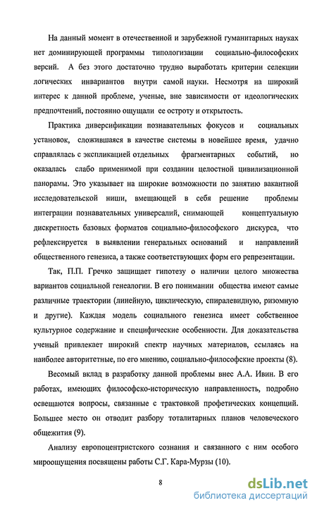 Так, П.П. Гречко защищает гипотезу о наличии целого множества вариантов социальной генеалогии. В его понимании общества имеют самые различные траектории (линейную, циклическую, спиралевидную, ризомную и другие). Каждая модель социального генезиса имеет собственное культурное содержание и специфические особенности. Для доказательства ученый привлекает широкий спектр научных материалов, ссылаясь на наиболее авторитетные, по его мнению, социально-философские проекты (8).