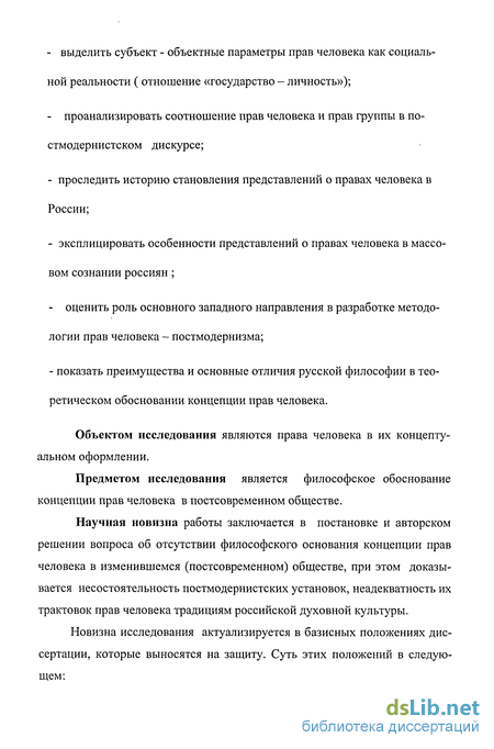 Научная новизна работы заключается в постановке и авторском решении вопроса об отсутствии философского основания концепции прав человека в изменившемся (постсовременном) обществе, при этом доказывается несостоятельность постмодернистских установок, неадекватность их трактовок прав человека традициям российской духовной культуры.
