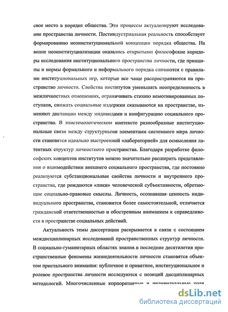 В авторской программе исследования пространства личности в качестве исходной методологической установки выдвигается философски обоснованная категория институциализации. Выделенные диссертантом концепты социальных институтов, раскрывающие содержательные признаки институциализации, отражают разные пространственные структуры общественной и частной жизни. Наличие институциональной матрицы в