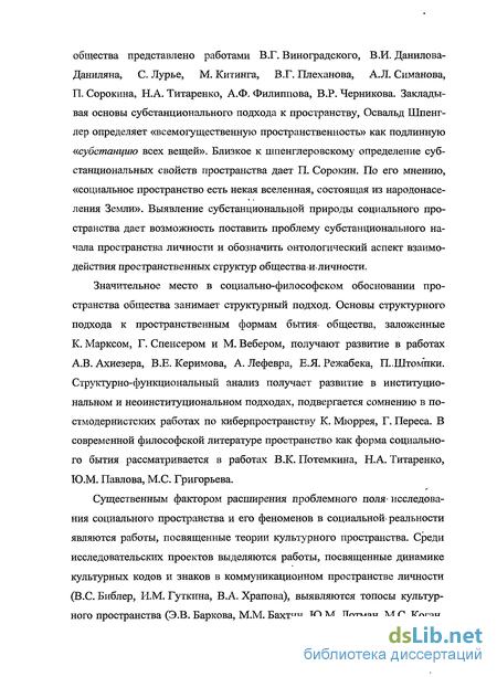 специфику пространственно-временных форм бытия общества и различных форм движения материи. Это работы В.А. Атемова, Э. Гидденса, А.А. Давыдова, А.Н. Лойя, Н.Н. Трубникова, Э. Холла, В.П. Яковлева. Исследование географических и субстанциональных свойств пространства общества представлено работами В.Г. Виноградского, В.И. Данилова-Даниляна, С. Лурье, М. Китинга, В.Г. Плеханова, А.Л. Симанова, П. Сорокина, Н.А. Титаренко, А.Ф. Филиппова, В.Р. Черникова. Закладывая основы субстанционального подхода к пространству, Освальд Шпенглер определяет «всемогущественную пространственность» как подлинную «субстанцию всех вещей». Близкое к шпенглеровскому определение субстанциональных свойств пространства дает П. Сорокин. По его мнению, «социальное пространство есть некая вселенная, состоящая из народонаселения Земли». Выявление субстанциональной природы социального пространства дает возможность поставить проблему субстанционального начала пространства личности и обозначить онтологический аспект взаимодействия пространственных структур общества и личности.