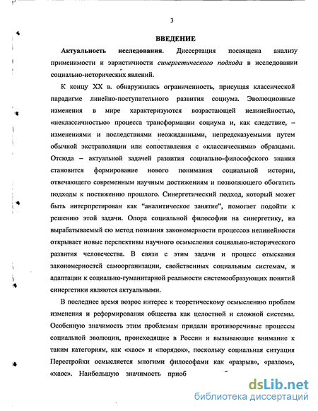 К концу XX в. обнаружилась ограниченность, присущая классической парадигме линейно-поступательного развития социума. Эволюционные ,. изменения в мире характеризуются возрастающей нелинейностью, «неклассичностью» процесса трансформации социума и, как следствие, І изменениями и последствиями неожиданными, непредсказуемыми путем обычной экстраполяции или сопоставления с «классическими» образцами. Отсюда — актуальной задачей развития социально-философского знания становится формирование нового понимания социальной истории, отвечающего современным научным достижениям и позволяющего обогатить і : подходы к постижению прошлого. Синергетический подход, который может \ быть интерпретирован как "аналитическое занятие", помогает подойти к решению этой задачи. Опора социальной философии на синергетику, на вырабатываемый ею метод познания закономерности процессов нелинейности открывает новые перспективы научного осмысления социально-исторического развития человечества. В связи с этим задачи и процесс отыскания \ закономерностей самоорганизации, свойственных социальным системам, и \ адаптации к социально-гуманитарной реальности системообразующих понятий синергетики являются актуальными.