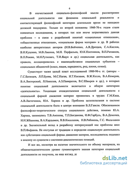 Существует также целый пласт исследований 1980-90-х гг. (авторы — Г.С.Батищев, Л.П.Буева, М.С.Каган, И.Т.Касавин, В.Ж.Келле, В.А.Кемеров, В.А.Лекторский, Л.Николов, А.З.Панкратов, В.С.Швырев и др.), в которых понятие социальной деятельности включается в общую категорию «деятельность». Тенденция отождествления социальной деятельности с социальной формой движения материи проявилась в трудах Г.М.Каца, А.В.Ласточкина, ЮА. Харина и др. Проблема целеполагания в системе социальной деятельности была в центре внимания В.Л.Гавели. Обоснованием философско-теоретического статуса социального действия, помимо Ю.А. Харина, занимались Т.В.Ампеева, Т.П.Богданова, И.Ф.Гарбусь, В.А.Демичев, И.И.Жбанкова, В.А.Кардымон, В.В.Косолапов, Н.В.Рябоконь, Г.С. Фильчиков и др. Значительный вклад в разработку интересующей нас проблемы внес В.П.Фофанов. Не отступая от традиции и определяя социальную деятельность как субстанцию социальной формы движения материи, исследователь подошел к анализу ее сущности с системно-диалектических позиций.