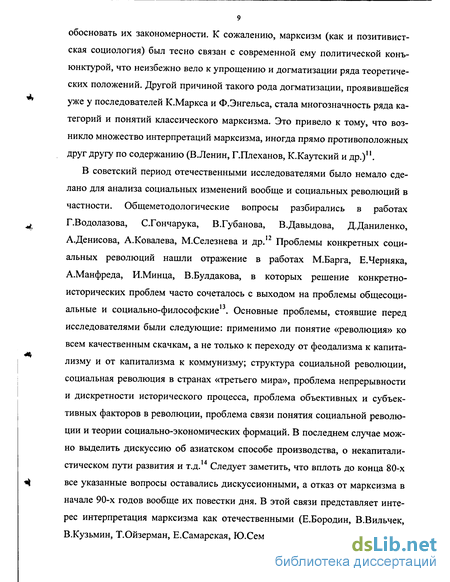 В советский период отечественными исследователями было немало сделано для анализа социальных изменений вообще и социальных революций в частности. Общеметодологические вопросы разбирались в работах Г.Водолазова, С.Гончарука, В.Губанова, В.Давыдова, Д.Даниленко, А.Денисова, А.Ковалева, М.Селезнева и др. Проблемы конкретных социальных революций нашли отражение в работах М.Барга, Е.Черняка, А.Манфреда, И.Минца, В.Булдакова, в которых решение конкретно-исторических проблем часто сочеталось с выходом на проблемы общесоциальные и социально-философские13. Основные проблемы, стоявшие перед исследователями были следующие: применимо ли понятие «революция» ко всем качественным скачкам, а не только к переходу от феодализма к капитализму и от капитализма к коммунизму; структура социальной революции, социальная революция в странах «третьего мира», проблема непрерывности и дискретности исторического процесса, проблема объективных и субъективных факторов в революции, проблема связи понятия социальной революции и теории социально-экономических формаций. В последнем случае можно выделить дискуссию об азиатском способе производства, о некапиталистическом пути развития и т.д.14 Следует заметить, что вплоть до конца 80-х все указанные вопросы оставались дискуссионными, а отказ от марксизма в начале 90-х годов вообще их повестки дня. В этой связи представляет интерес интерпретация марксизма как отечественными (Е.Бородин, В.Вильчек, В.Кузьмин, Т.Ойзерман, Е.Самарская, Ю.Семенов, Л.Чинакова)15, так и зару-