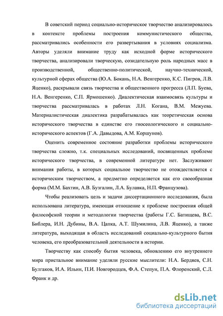 Понятие «творчество» – одно из наиболее неоднозначных и противоречивых понятий в философии. Этот факт отражает сложность и парадоксальность самого творчества как объекта исследования. Изучение творчества имеет длительную историю, в настоящее время разработка проблем творчества ведется с разных концептуальных позиций, в рамках конкретно-научных подходов и комплексных, междисциплинарных исследований, разрабатываются экспериментальные методы изучения механизмов протекания творческого процесса, способы и приемы стимулирования креативной деятельности. Однако, несмотря на широкое освещение проблемы творчества в литературе, оно преимущественно рассматривается как индивидуально-психологическая деятельность, а социально-исторический и социокультурный аспекты творчества представлены достаточно скромно. За рамками проблематики творчества оказываются вопросы, раскрывающие социально-аксиологическую сущность исторического творчества. Восполнить этот пробел и было целью данной диссертационной работы.