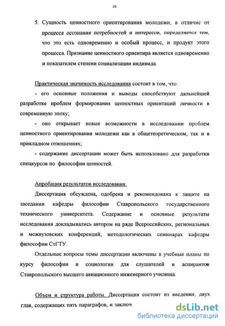 Реферируемая работа воспроизводит один из возможных вариантов трактовки указанной в заглавии темы. Мы следуем тем тенденциям, которые уже наметились в отечественной философской литературе при рассмотрении ценности и ценностного ориентирования как общефилософских понятий, как центральных категорий общей теории ценностей. Имеются в виду прежде всего исследования В.П. Тугаринова, В.А. Василенко, В.Ф. Сержантова и В.В. Гречаного, некоторые работы О.Г. Дробницкого. Вместе с тем в диссертации затрагивается иной, по сравнению с ранее рассмотренным, круг вопросов, обращается внимание на некоторые новые аспекты и возможные подходы в изучении излагаемой темы. Важная особенность работы состоит в том, что она ориентирована не столько на содержательные результаты исследований из области ценностной проблематики, сколько на предварительное обсуждение некоторых сторон проблемы ценностного ориентирования молодежи.
