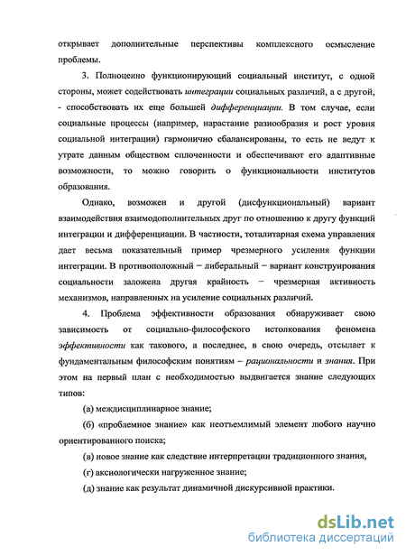 3. Полноценно функционирующий социальный институт, с одной стороны, может содействовать интеграции социальных различий, а с другой, – способствовать их еще большей дифференциации. В том случае, если социальные процессы (например, нарастание разнообразия и рост уровня социальной интеграции) гармонично сбалансированы, то есть не ведут к утрате данным обществом сплоченности и обеспечивают его адаптивные возможности, то можно говорить о функциональности институтов образования.