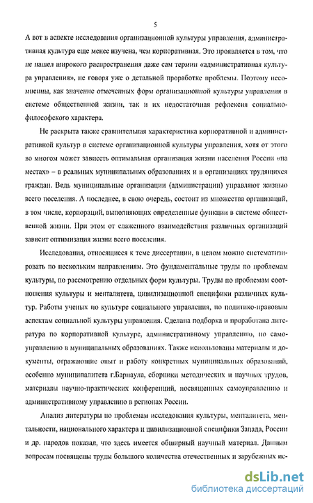 Исследования, относящиеся к теме диссертации, в целом можно систематизировать по нескольким направлениям. Это фундаментальные труды по проблемам культуры, по рассмотрению отдельных форм культуры. Труды по проблемам соотношения культуры и менталитета, цивилизационной специфики различных культур. Работы ученых но культуре социального управления, по политико-правовым аспектам социальной культуры управления. Сделана подборка и проработана литература по корпоративной культуре, административному управлению, по самоуправлению в муниципальных образованиях. Также использованы материалы и документы, отражающие опыт и работу конкретных муниципальных образований, особенно муниципалитета г.Барнаула, сборники методических и научных ірудов, материалы научно-практических конференций, посвященных самоуправлению и административному управлению в регионах России.