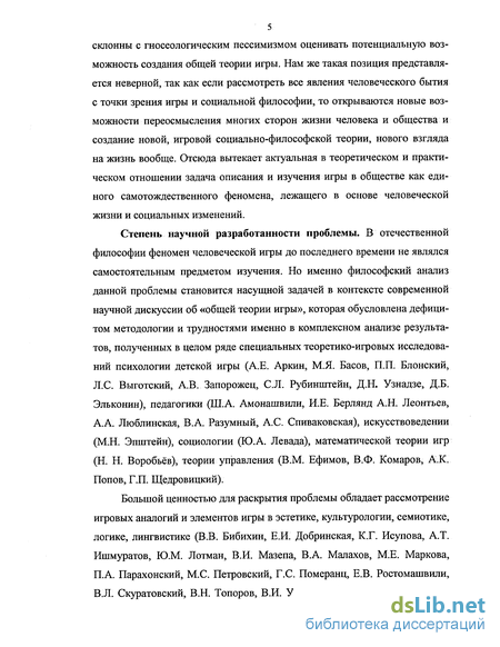 Степень научной разработанности проблемы. В отечественной философии феномен человеческой игры до последнего времени не являлся самостоятельным предметом изучения. Но именно философский анализ данной проблемы становится насущной задачей в контексте современной научной дискуссии об «общей теории игры», которая обусловлена дефицитом методологии и трудностями именно в комплексном анализе результатов, полученных в целом ряде специальных теоретико-игровых исследований психологии детской игры (А.Е. Аркин, М.Я. Басов, П.П. Блонский, Л.С. Выготский, А.В. Запорожец, С.Л. Рубинштейн, Д.Н. Узнадзе, Д.Б. Эльконин), педагогики (Ш.А. Амонашвили, И.Е. Берлянд А.Н. Леонтьев, А.А. Люблинская, В.А. Разумный, А.С. Спиваковская), искусствоведении (М.Н. Эпштейн), социологии (Ю.А. Левада), математической теории игр (Н. Н. Воробьёв), теории управления (В.М. Ефимов, В.Ф. Комаров, А.К. Попов, Г.П. Щедровицкий).