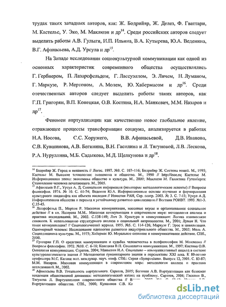 Проблема оценки роли и места информационных технологий в современном социокультурном пространстве выносится в центр внимания в трудах таких западных авторов, как: Ж. Бодрийяр, Ж. Делез, Ф. Гваттари, М. Кастельс, У. Эко, М. Маклюэн и др14. Среди российских авторов следует выделить работы А.В. Гулыги, И.П. Ильина, В.А. Кутырева, Ю.А. Веденина, В.Г. Афанасьева, А.Д. Урсула и др1э.