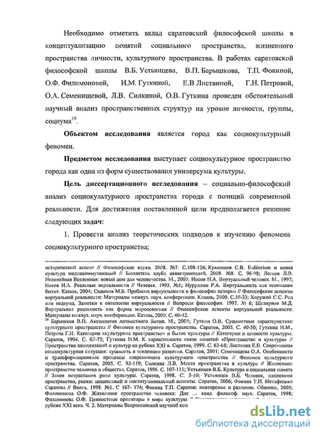 Необходимо отметить вклад саратовской философской школы в концептуализацию понятий социального пространства, жизненного пространства личности, культурного пространства. В работах саратовской философской школы В.Б. Устьянцева, В.П. Барышкова, Т.П. Фокиной, О.Ф. Филимоновой, И.М. Гуткиной, Е.В Листвиной, Г.Н. Петровой, О.А. Семенищевой, Л.В. Силкиной, О.В. Гуткина проведен обстоятельный научный анализ пространственных структур на уровне личности, группы, социума19.