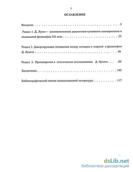Структура представленной диссертации такова. Работа состоит из введения, трёх разделов, заключения и библиографического списка использованной литературы. Первый раздел «Д. Лукач - основоположник диалектико-гуманного неомарксизма в социальной философии XX века» содержит исследование творческой судьбы философа, анализирует его теоретический вклад в социальную философию. В связи с развёрнутой социально-философской проблематикой кратко рассмотрены основные течения западной марксисткой мысли XX столетия.
