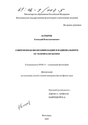 Батыров Геннадий Константинович. Современная философия нации и национального : От теории к практике : диссертация ... кандидата философских наук : 09.00.11.- Волгоград, 2002.- 157 с.: ил. РГБ ОД, 61 02-9/407-5