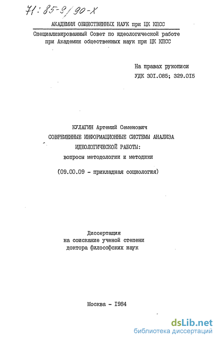 Кулагин Артемий Семенович. Современные информационные системы анализа идеологической работы вопросы методологии и методики : вопросы методологии и методики Москва, 1984 429 c. : ил РГБ ОД 71:85-9/90
