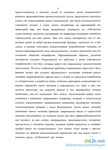 Степень научной разработанности проблемы. Как таковая проблема конфликта и взаимодействия гуманистического и экологического дискурса ещё не ставилась, во всяком случае, специальных работ, посвящённых этой проблеме, насколько можно судить, не выходило. В своём сопоставительном анализе автор ориентировался главным образом на произведения самих представителей современного гуманизма и экологизма, а также их идейных предшественников и вдохновителей. На первое место здесь следует поставить работы Хайдеггера, посвящённые, так называемому, «европейскому нигилизму» и «философии субъективности», под которой немецкий мыслитель понимает философию Нового времени. Именно хайдеггеровская критика философии Просвещения послужила главным толчком для появления на свет как экологического, так и нового гуманистического дискурса, первый из которых в целом следует критическому настрою Хайдеггера в отношении европейской мысли Нового времени (и сопутствующей ей идеологии господства человека над природой, включая сюда не только работы самих основателей модерной философии и представителей Просвещения, но и марксистский утопизм), что касается второго, то он, напротив, склонен критиковать саму хайдеггеровскую критику гуманизма, в то же время дистанцируясь от концепции традиционного (классического) гуманизма. Современный гуманизм ориентируется, в этом плане, с одной стороны, на ответ Жан-Поля Сартра Хайдеггеру («Экзистенциализм – это гуманизм»), в котором Сартр выдвигает собственный проект экзистенциальной философии, радикально расходящийся с «антигуманистическим» проектом Хайдеггера, а с другой – на практическую (этическую) философию Канта, полагающую в качестве основной гуманистической ценности автономию человека (в противоположность гетерономии), выступающую как условие и проявление его свободы. Большой интерес при написании данной работы представляли в этом отношении две книги: «Эра индивида» Алена Рено, в которой он подвергает систематической и глубокой критике хайдеггеровскую концепцию философии Нового времени как философии субъективности, и «Мудрость современности» Андре Конт-Спонвиля и Люка Ферри, в которой ведётся дискуссия по различным вопросам современности, в том числе, по проблемам экологии и гуманизма. Рассмотрение экологического дискурса потребовало от автора данной работы обращения к его истокам и концептуальной предыстории.