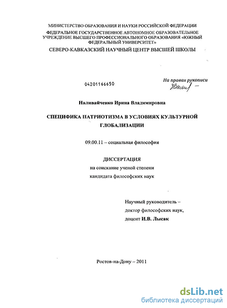 Большой вклад в разработку проблемы патриотизма на современном этапе внесли отечественные философы В.И. Лутовинов и СЮ. Иванова. В.И. Лутовинов рассматривает патриотизм как важнейшее качество личности и жизненный принцип человека. Он анализирует патриотизм с аксиологических позиций в качестве одной из значимых непреходящих ценностей, присущей всем сферам жизни общества и государства1, рассматривает влияние процессов глобализации на патриотизм, уделяя особое внимание принципам формирования патриотизма в современном российском обществе. СЮ. Иванова предлагает рассматривать патриотизм как сложное социокультурное явление, пронизывающее все основные стороны жизни и деятельности как общества, так и отдельной личности . Патриотизм рассматривается ею в разных аспектах: как одна из составляющих общественного и индивидуального сознания, менталитета, национального самосознания, как компонент идеологии, культуры, истории, психологии, как одна из высших ценностей общества и личности, как направление воспитания, как источник благополучия, благосостояния и успешного развития важнейших сфер жизни общества. Большое внимание СЮ. Иванова уделяет изменениям патриотической культуры в условиях глобализации и социокультурной трансформации в России. Именно концепции патриотизма В.И. Лутовинова и СЮ. Ивановой послужили отправной точкой для формирования авторского подхода к исследованию патриотизма.