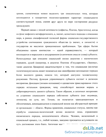 Первый связан с эпохой античности (софисты, Платон, Аристотель), когда на фоне мифолого-метафорического, а, значит, целостного подхода к описанию мира, в рамках специфической полисной формы социально-государственного устройства соотношение гражданского общества (а значит, и личности) и государства не мыслится принципиально проблемным. Три сферы бытия объединены одним контекстом — идеей справедливости, — который воплощается в моральном и воздержанном (в античном смысле слова) субъекте. Используемые при описании социальной жизни аналогии с космическим порядком, душой (например, в диалогах Платона «Государство», «Законы», также диалогах Цицерона) свидетельствуют о том, что социальная (включая политическую) жизнь может пониматься как своеобразное воплощение порядка более высокого уровня, нежели тот, который доступен человеческому разумению. Поэтому функция управляющего субъекта состоит в должном восприятии, фиксации (личном осознании) и адекватном транслировании этого порядка остальным гражданам, чему способствует высокая мораль и добропорядочность данного субъекта. Таким образом, в античных воззрениях на устроение социального порядка собственно субъекта (как индивида, личности), по сути, нет. Точнее, он полагается трансцендентным и обезличенным, воплощающимся в социальной жизни как абстрактный принцип ее организации — «благо». Формы правления, социальные статусы, законы как атрибуты социально-политической жизни являются лишь отражением космического порядка, онтологического «блага». Человек, включенный в социальный процесс, т.е., любой человек, заведомо признается вступившим на путь достижения этого блага. Античная мысль, тем самым, методологически